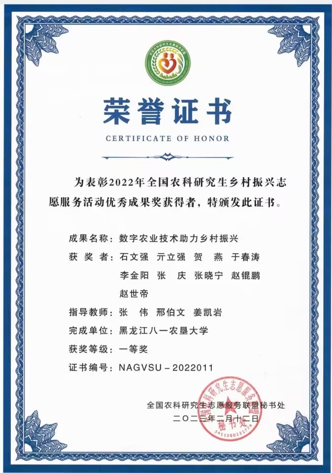 2023年2月12日,全国农科研究生志愿服务联盟秘书处发布了关于公布2022年全国农科研究生乡村振兴志愿服务活动优秀案例和优秀团队评选结果的通知,U8国际张伟教授团队指导研究生开展的“数字农业技术助力乡村振兴”成果荣获一等奖。
