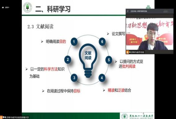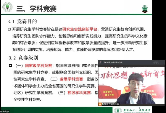 刘昶希从学习经历、文章撰写、研讨交流、科研竞赛等方面进行分享,在日常的学习中,他勉励大家勤学勤钻、掌握专业知识、广泛查阅资料、主动与导师沟通,找到适合自己的学习方法和学习技巧。他鼓励大家参与学术研讨会,在学术会议中听取国内外专家学者的学术报告、掌握研究方向的最新成果和进展与参会学者互动交流,会后总结归纳,寻求突破口和创新点,激发学术灵感。
