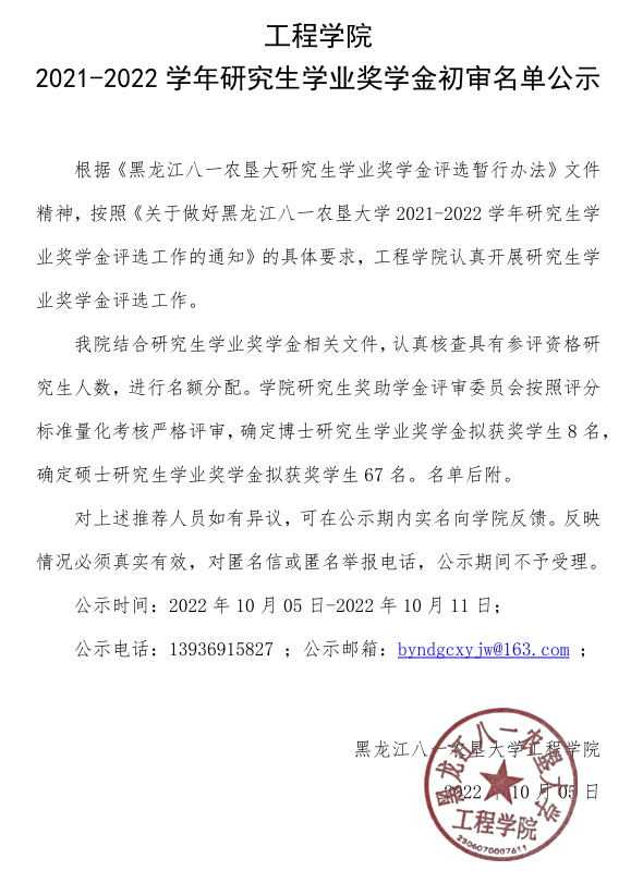 公司2021-2022 学年研究生学业奖学金初审名单公示