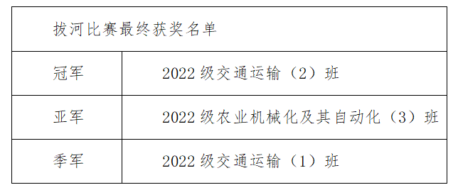 通过此次拔河活动,我深刻感受到了大家的集体意识和拼搏精神。虽然我们班没有得到冠军,但我认为从中我们不单单收获了快乐,一定程度上还缓解了学习带来的压力,在强健体魄的同时促进了精神健康,展现出工程学子的昂扬风貌。农机三班的拼搏精神、顽强的意志、集体荣誉感、对比赛的投入都是我们不可多得的收获。
