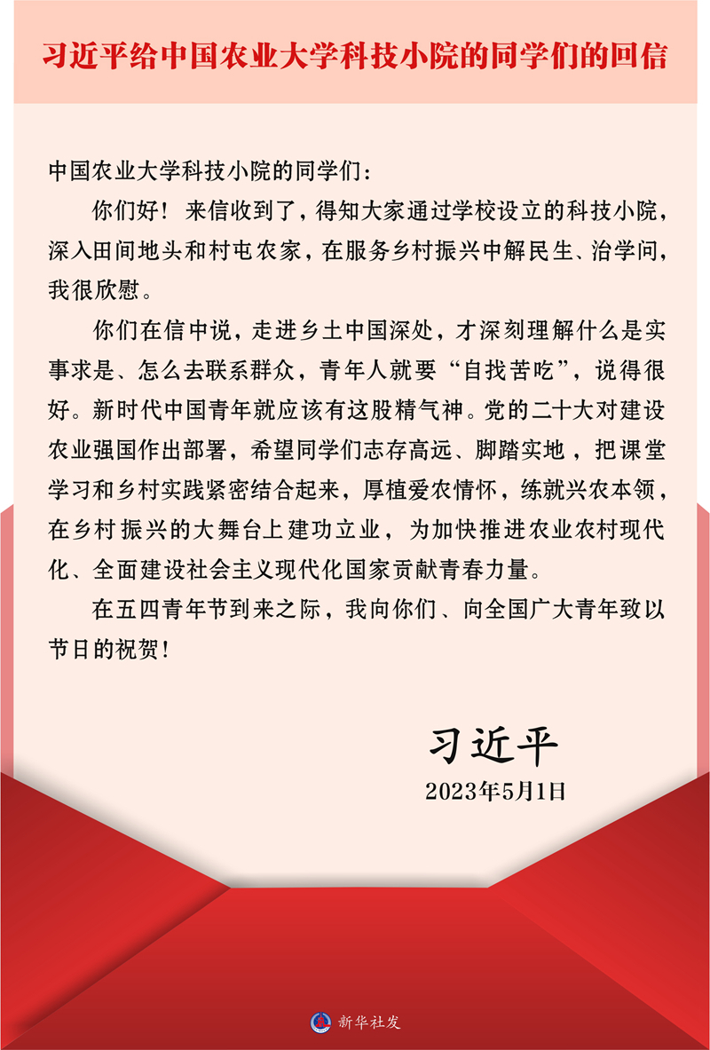 新华社北京5月3日电 中共中央总书记、国家主席、中央军委主席习近平近日给中国农业大学科技小院的同学们回信,提出殷切期望,并在五四青年节到来之际,向全国广大青年致以节日的祝贺。