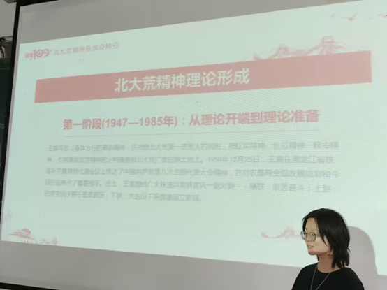 22级农机1班郝超乙通过不畏艰险顽强拼搏的艰苦奋斗精神、解放思想敢闯新路的勇于开拓精神、胸怀全局富国强民的顾全大局精神、不计得失勇于牺牲的无私奉献精神四个方面,向广老员工展现了20世纪50年代初我国十万转业官兵在东北三江平原的亘古荒原上发起的伟大壮举。