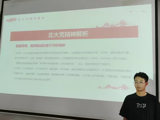 22级机制1班涂创从北大荒精神的孕育形成入手,讲述了几代拓荒者在开发北大荒的壮丽事业中所付出的艰苦努力,引出“艰苦奋斗、勇于开拓、顾全大局、无私奉献”的北大荒精神,讲述了他们在垦荒过程中所表现出来的高度的政治觉悟、崇高的思想境界和奋发向上的精神风貌。