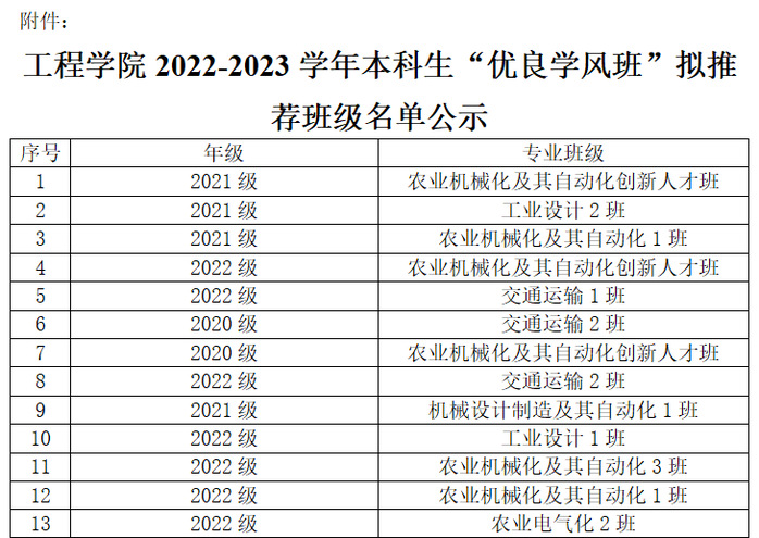 依据《U8国际本科生奖励规定》《U8国际奖助学金评选及管理办法》,U8国际2022-2023学年本科生“优良学风班”评选工作已经完成班级申报、公司材料审核等环节,决定拟推荐2021级农业机械化及其自动化创新人才班等13个班级获得2022-2023学年本科生“优良学风班”,现向全院师生公示,详细名单见附件。