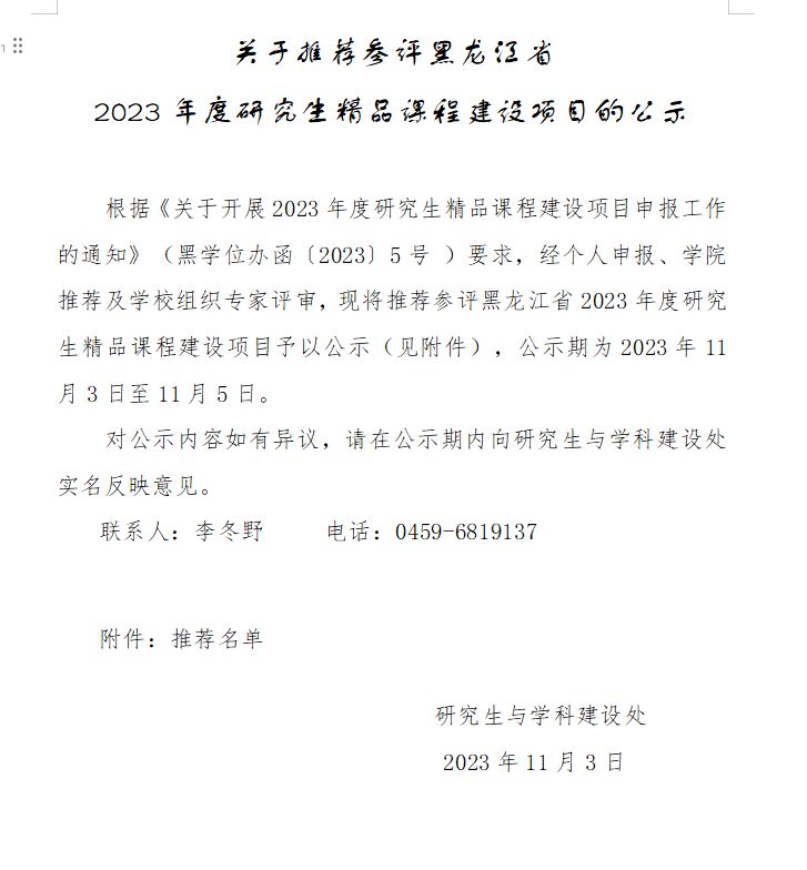 关于推荐参评黑龙江省2023年度研究生精品课程建设项目的公示