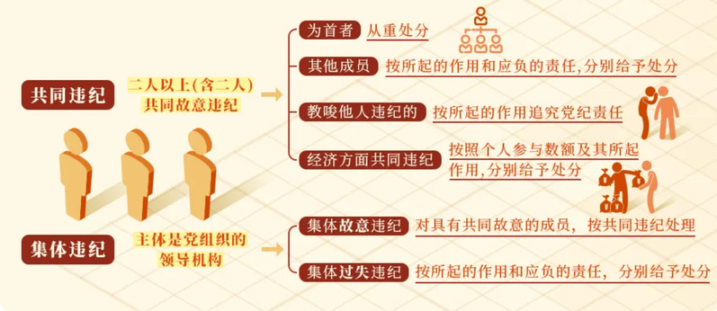 《中国共产党纪律处分条例》规定,共同违纪主要是指二人以上(含二人)共同故意违纪。为首者,主要是指在共同违纪中起主要作用的党员。除非《条例》另有规定,对为首者,从重处分。对其他成员,按照其在共同违纪中所起的作用和应负的责任,分别给予处分。教唆,主要是指以授意、怂恿、劝说、利诱或者其他方法故意唆使他人违纪,行为人必须具有教唆他人实施违纪的故意。教唆他人违纪的,按照其在共同违纪中所起的作用追究党纪责任。值得注意的是,新修订的《条例》将经济方面共同违纪的,由按照“个人所得数额”调整为按照“个人参与数额”及其所起作用,分别给予处分。还规定对共同违纪的为首者,情节严重的,按照共同违纪的总数额处分。这一数额认定规则,与刑法规定的共同犯罪中各行为人犯罪数额通常以行为人实际参与数额计算的做法,实现了贯通。与共同违纪不同,集体违纪的主体是党组织的领导机构。集体违纪包括集体故意违纪和集体过失违纪两种情况。党组织领导机构集体作出违犯党纪的决定或者实施其他违犯党纪的行为,对具有共同故意的成员,按共同违纪处理;对过失违纪的成员,按照各自在集体违纪中所起的作用和应负的责任分别给予处分。需要留意不能以“集体领导”“集体负责”“集体研究”等为借口,不追究集体作出违纪决定或者集体实施违纪行为的领导成员责任。但是,以下两种情形不属于集体违纪:一是个人违反民主集中制的原则,擅自作出错误决定,不能追究集体责任,只能按照个人违纪处理。二是对于在领导机构作出错误决定或者实施错误行为时,没有参与或者表示反对的,不视为集体违纪人员。