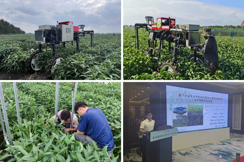 在北大荒集团九三分公司尖山农场现场,张伟教授团队展示了系统集成的卫星遥感、无人机技术和自走式田间大豆表型信息采集车等先进技术,构建了“天-空-地-人-机”一体化检测体系,实现了大豆生产的全程智能管理与精准作业。团队通过物联网系统远程演示了田间大豆信息采集、数据传输、智能分析与决策等功能,获得了参会领导的高度评价。