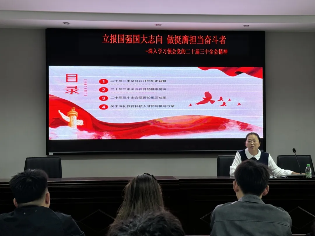 宋清萍围绕二十届三中全会召开的历史背景、基本情况、取得的重要成果及关于深化教育科技人才体制机制改革四个方面进行讲解。会议强调,要深入学习领会二十届三中全会精神,深刻领会把握进一步全面深化改革的主题、目标要求、重大原则、重大举措和根本保证。要认清形势、牢记使命、把准方向,始终做到“三个清醒”,把二十届三中全会精神要求和习近平总书记重要讲话作为重大机遇和新起点,清醒地认识到肩负的历史使命,不断实干、不断发展、不断进步。