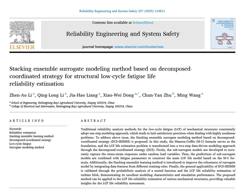 近日,运筹学顶级期刊Reliability Engineering & System Safety(简称RESS,中科院一区TOPIF9.4)在线发表了题为Stacking ensemble surrogate modeling method based on decomposed-coordinated strategy for structural low-cycle fatigue life reliability estimation的研究成果。硕士研究生李振澳为论文第一作者,论文通讯作者为董晓威教授。