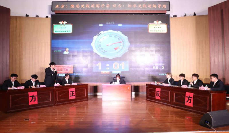 正方代表“时来运转”队以“隐忍更能消解矛盾”为辨论观点,指出“隐忍并非懦弱,而是以退为进的智慧”,强调隐忍是避免矛盾激化的缓冲剂,论证隐忍能降低冲击烈度为理性协商争取空间。反方代表“杠上开花”队则立足于现代社会高效沟通的需求,主张坦率是解决问题的核心路径,认为“坦率更能消解矛盾”,通过多重举例力证坦率能精准定位矛盾核心,推动问题得到根本性解决。